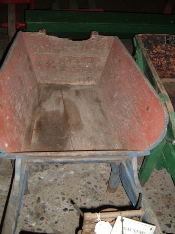 About this objectBarrow. Wooden wheel barrow with damaged tipping end.